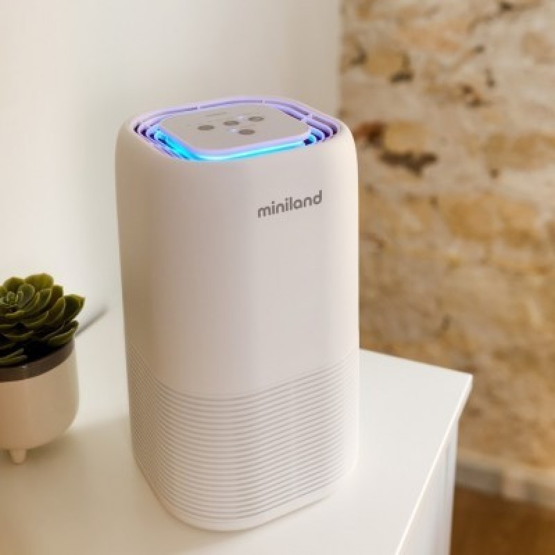 Miniland BabyPure 5 - самый современный очиститель воздуха с функцией ионизации для глубокой очистки. 5 уровней фильтрации: 1. Предварительный фильтр удаляет крупные частицы 2. HEPA фильтр удаляет мельчайшие частицы размером до 0,3 мкм (например, аллергены, пыльца, пыль или споры) 3. Фильтр с активированным углем поглощает нежелательные запахи в комнате. 4. Уровень очистки осуществляется с использованием ультрафиолетовых лучей, которые устраняют 99% бактерий, вирусов и микробов. 5. Еще более глубокий уровень с функцией ионизации для улавливания загрязняющих частиц с помощью отрицательных ионов. Помимо этого, умный гаджет имеет ряд отличительных особенностей и функций. 2 варианта ночного режима: без подсветки и как ночник (светильник с мягкой голубой подсветкой). Подходит для маленьких комнат в квартирах, загородных домах, офисах, площадью до 15 кв. метров. Цветовой индикатор качества воздуха. Таймер отключения. Сенсорная панель управления. 4 скорости потока (включая турбо-режим). Портативный. Красивый лаконичный дизайн впишется в интерьер любой, в том числе и детской комнаты. Бесшумный. Прост и безопасен в эксплуатации. Оснащен фильтром 3-в-1 для удаления пыли и неприятных запахов из воздуха